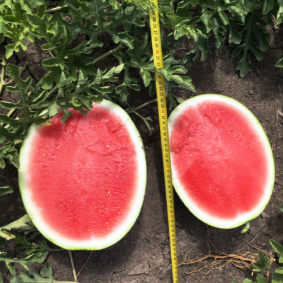 Плоды округло-овальной формы, однородные, с привлекательной темно-зеленой корой в полоску типа Кримсон Свит. Средняя масса 6-8 кг. Мякоть интенсивно-красная, хрустящая, очень сладкая — содержание сахара достигает 13-14% по шкале Брикса, с выраженным ароматом. Гибрид демонстрирует отличную транспортабельность и лежкость, что делает его идеальным для поставок в торговые сети и на рынок свежей продукции.