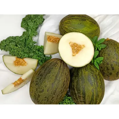 Плоды привлекательной овальной формы, массой 2,5-4,5 кг (в среднем 2,0-3,5 кг). Кожура темно-зеленого цвета с легкой рельефностью и характерной для сортотипа сеточкой. Мякоть — белоснежная, плотная, хрустящая, очень сочная с высоким содержанием сахаров (7-13% Brix). Отличительная особенность — маленькая семенная камера.