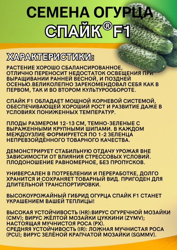 Купить Спайк F1 семена огурца корнишона раннего вы можете в компании Ваш агроном, оформив заказ в интернет магазине, или