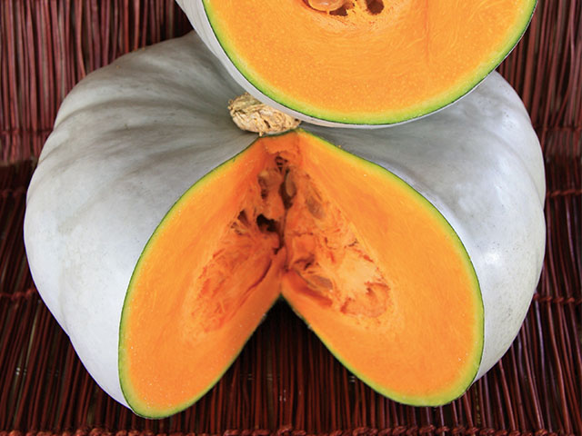 Плоды плоскоокруглой формы, без ребер, массой 3-5 кг. Имеют оригинальную серую окраску кожуры и плотную оранжевую мякоть, которая быстро набирает вкус после уборки. Гибрид отличается высокой устойчивостью к механическим повреждениям при уборке, что критически важно для коммерческого производства.