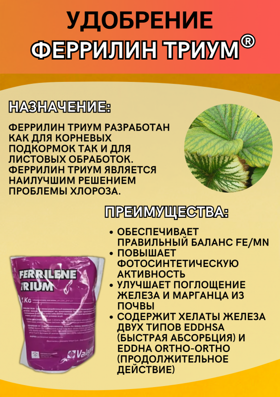 Высокоэффективный хелат железа Ferrilene Trium (Феррилин Триум) от компании Valagro в кратчайшие сроки устраняет дефицит железа (эффект виден через несколько дней, лист растения приобретает более зеленый насыщенный цвет).